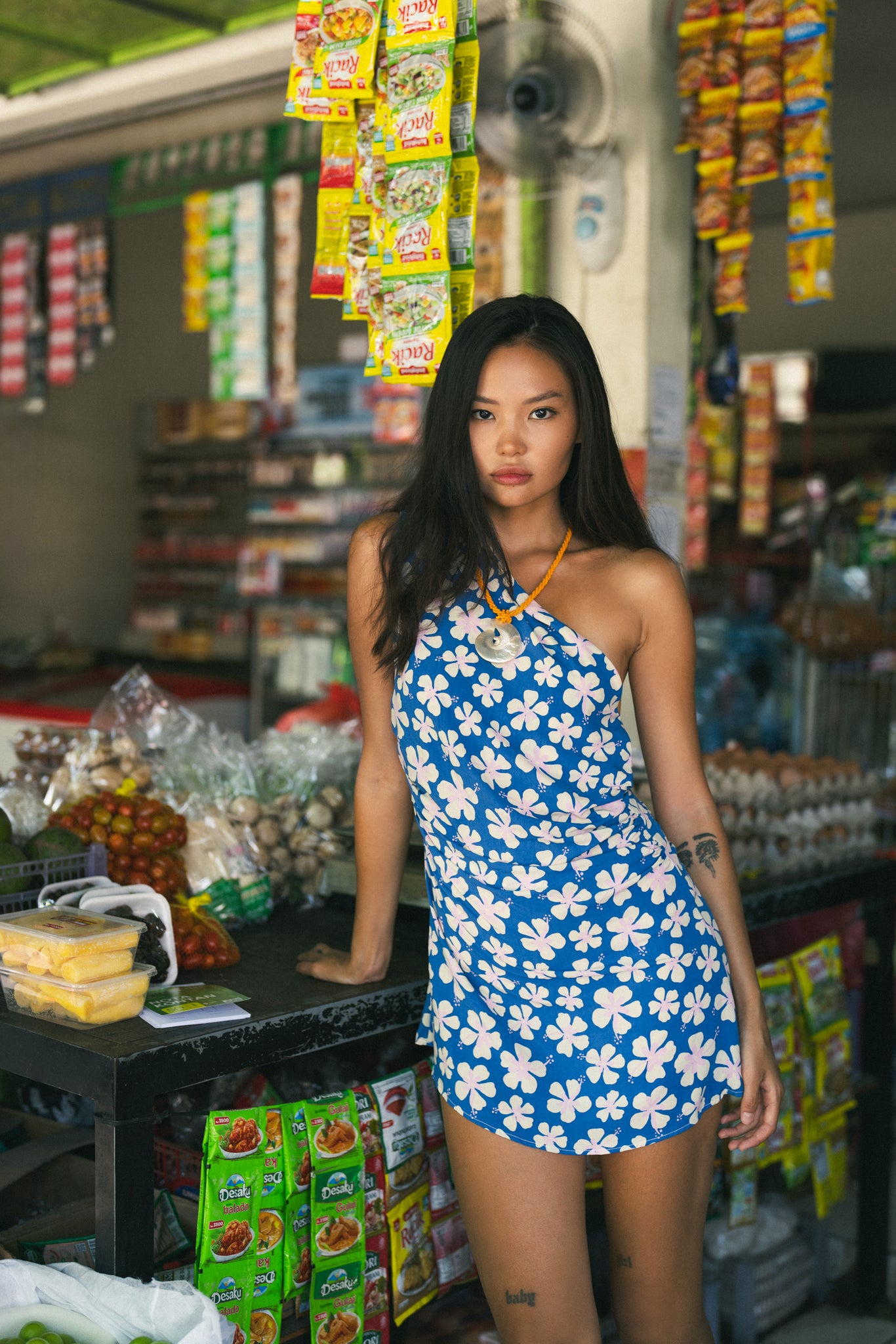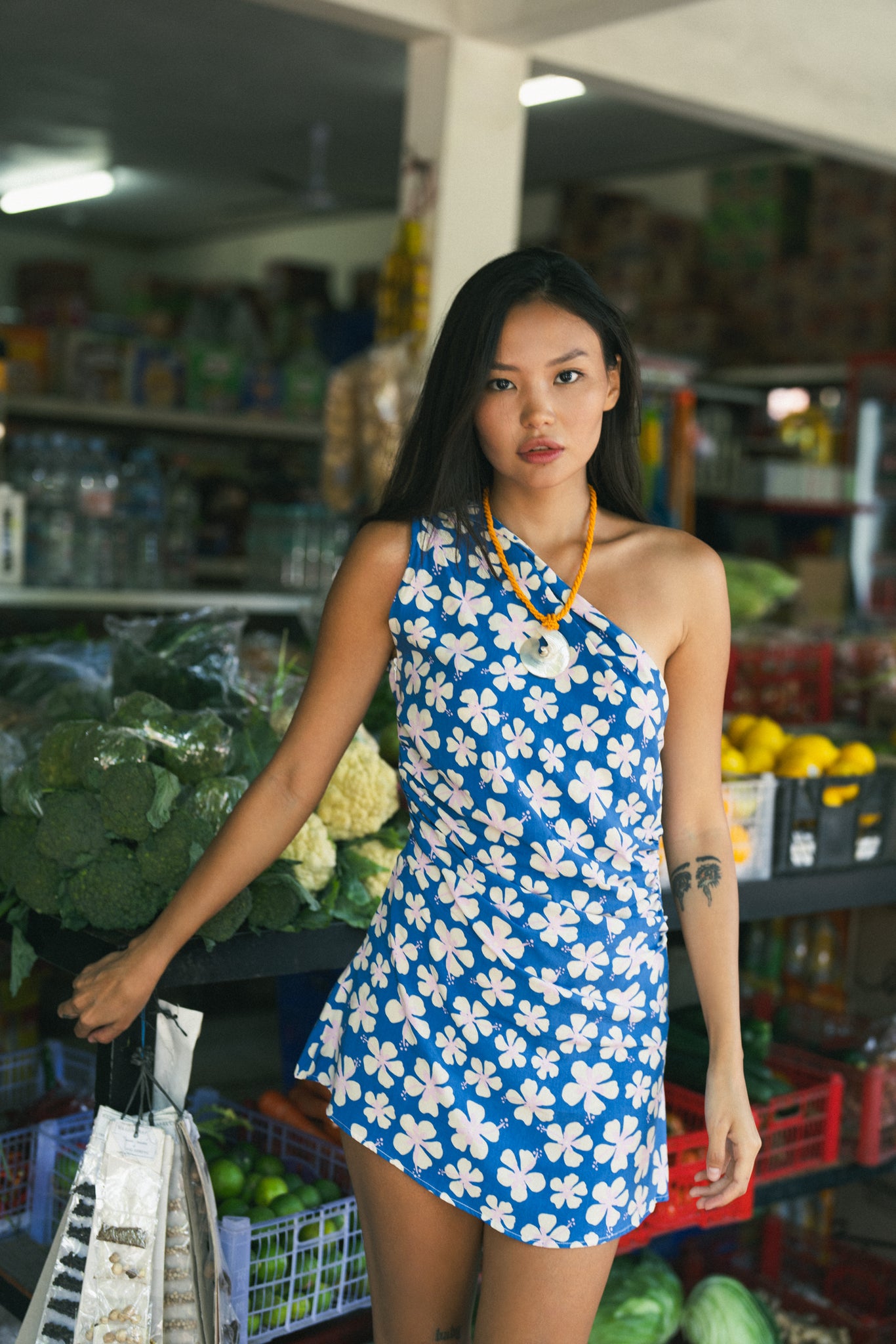 A one-shoulder mini dress featuring a retro hibiscus print. Designed with an asymmetrical neckline and a straight, easy fit that sits comfortably on the body. Lightweight, flattering, and perfect for warm days or dressed-up evenings.